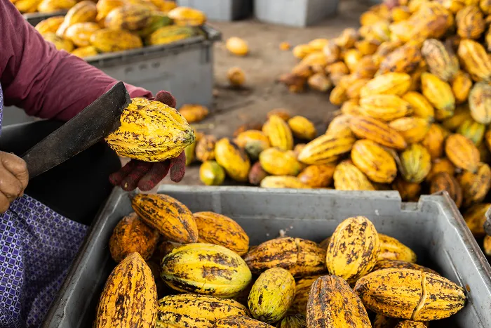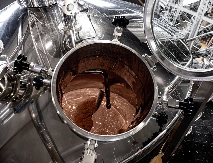 After roasting, the beans are cracked and shelled to obtain cacao nibs, which are ground into cocoa liquor as natural cocoa butter is released.